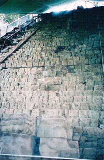 "Když Španělé přišli na toto místo, bylo město opuštěné. Celá řada důležitých artefaktů byla vybudována v období mezi roky 564 - 737 n.l. I když místní chrámy nejsou tak působivé jako ty v Tikal, najdeme zde zcela fantastickou výzdobu a jedinečné glyfy. Hieroglyfické schodiště je jedinečné v celém mayském světě. Severně od schodiště se nachází obrovské hřiště, které si dodnes uchovala perfektní podobu. Dole pod hřištěm se pak nachází série kamenných desek s velmi přesnými vytesanými detily mayských vůdců. Když britský diplomat John Lloyd Stephens toto místo v roce 1839 navštívil byl tak ohromený, že za 50 dolarů koupil celý archeologický park. Dokonce chtěl do své rodné Anglie většinu z artefaktů přestěhovat, ale naštěstí se tak nestalo."